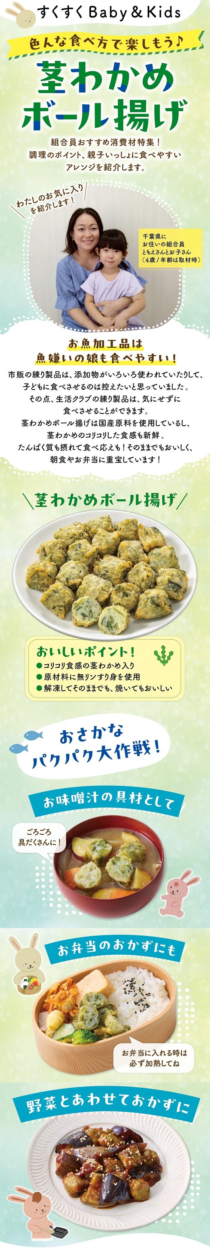 三陸沖で獲れたカナガシラの魚肉に提携先の木綿豆腐などを混ぜ、ニンニクなどで味付けして揚げました。子どもも食べやすい味つけです。自然解凍でお弁当にも。そのままでも食べられますが、ケチャップなどをつけるのもおすすめです。