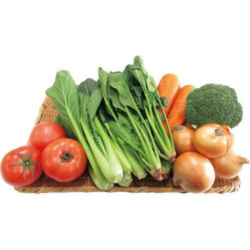 トマト500g、ブロッコリー1個、ほうれん草200g、小松菜200g、人参500g、玉ねぎ500g