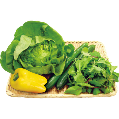 きゅうり2本、カラーピーマン1個、サラダ菜1個、ベビーリーフ25g