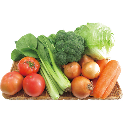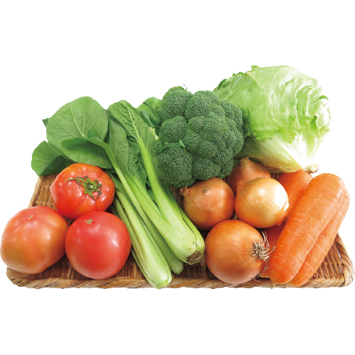 トマト500g、レタス1個、ブロッコリー1個、小松菜200g、人参500g、玉ねぎ500g