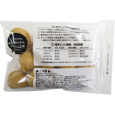 レンジアップ用の袋に小ぶりな新馬鈴薯が入ったセットで、レンジで温めるだけで美味しいふかし芋を作ることができます。袋に入った馬鈴薯を洗い、500ワットに設定した電子レンジで約5分加熱してください(レンジ出力によって加熱時間は調整してください)。調理方法詳細は袋にも記載しています。
