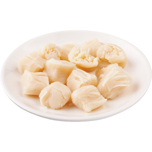 国産ほたて貝柱を加えた無リンたらすり身でつくりました。ほぐしやすいように繊維状に切れ目が入っています。トッピングに使いやすい一口サイズ。サラダのトッピングのほか、ほぐしてチャーハンの具材や茶わん蒸しなどにもおすすめです。