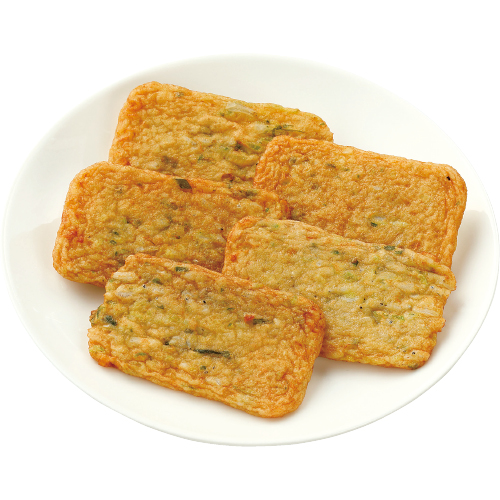 スケトウダラの無リンすり身に国産ちりめんと、甘みのある仙台の曲がりネギを練り込んだ揚げかまぼこです。薄揚げにすることで香ばしさを出しました。解凍してそのままでも食べられますが、レンジで温めたり、フライパンやトースターで炙るとより一層おいしくなります。