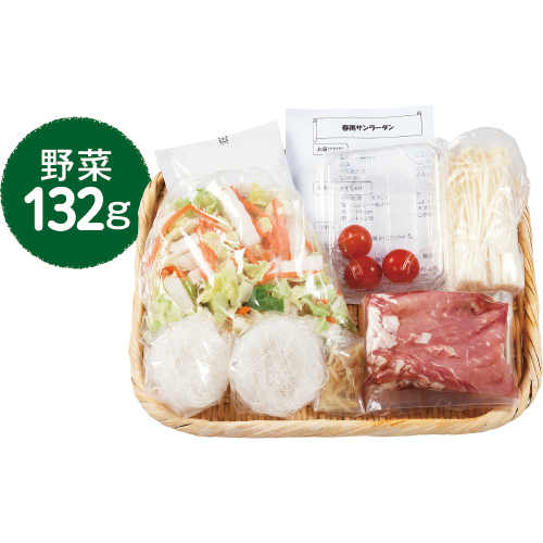 【具材】豚肉モモ細切り(解凍品・国産)、白菜(国産)、えのきたけ(国産)、ミニトマト(国産)、にんじん(国産)、しょうが(国産) 【添付調味料(チキンスープ)】食塩(国内製造)、チキンエキス(国内製造)、砂糖(国内製造)、魚醤、酵母エキス、オイスターエキス、たん白自己消化物、でん粉、チキンオイル、ホタテエキス、黒こしょう 【春雨】春雨(緑豆(中国))