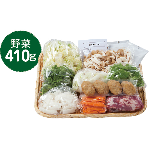 【具材】ぶなしめじ(国産)、白菜(国産)、豚肉切り落とし(解凍品・国産)、大根(国産)、春菊(国産)、長ねぎ(国産)、にんじん(国産)、水菜(国産) 【親鶏つくね】鶏肉(国産)、鶏軟骨(国産)、鶏皮(国産)、玉葱(国産)、馬鈴薯でん粉(馬鈴薯(国産))、鶏卵(国産)、パン粉(小麦を含む)、チキンブイヨン、砂糖、しょうゆ(大豆(遺伝子組み換えの混入を防ぐため分別)・小麦を含む)、しょうが(国産)、食塩、ホワイトペッパー、揚げ油(なたね油(遺伝子組み換えの混入を防ぐため分別)) 【添付調味料(白だし)】かつおだし(国内製造)、発酵調味料(液状ブドウ糖(甘藷(国産)、馬鈴薯(国産))、アルコール、米、本みりん、食塩、米麹)(国内製造)、しょうゆ(大豆(遺伝子組み換えの混入を防ぐため分別)・小麦を含む)(国内製造)、食塩、砂糖、酵母エキス、昆布エキス、鰹節エキス