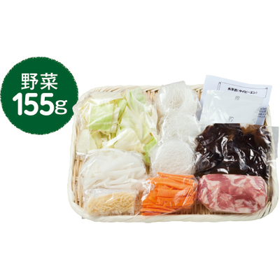 【具材】豚肉切り落し(解凍品・国産)、キャベツ(国産)、玉ねぎ(国産)、にんじん(国産)、しょうが(国産) 【添付調味料(チキンスープ)】食塩(国内製造)、チキンエキス(国内製造)、砂糖(国内製造)、魚醤、酵母エキス、オイスターエキス、たん白自己消化物、でん粉、チキンオイル、ホタテエキス、黒こしょう 【きくらげ】きくらげ(中国) 【春雨】春雨(中国)
