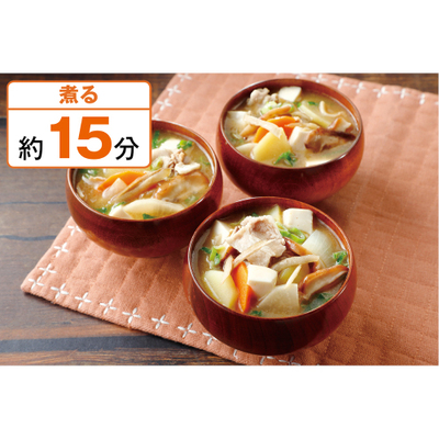 【充填豆腐】大豆(国産)/凝固剤(粗製海水塩化マグネシウム)【具材】豚肉バラスライス(解凍品・国産)、じゃがいも(国産)、大根(国産)、玉ねぎ(国産)、ごぼう(国産)、にんじん(国産)、しいたけ(国産)、青ねぎ(国産)【添付調味料(出汁入り味噌)】みそ(大豆(遺伝子組み換えでないものを分別)を含む)(国内製造)、食塩(国内製造)、酵母エキス、かつお節エキス、かつお節粉末、昆布エキス