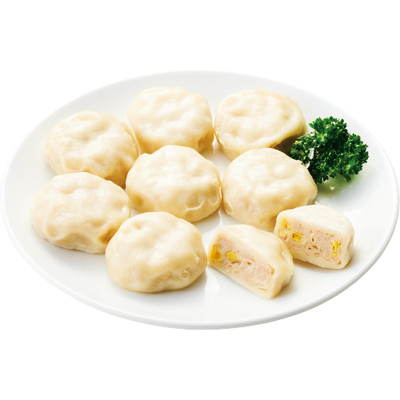 提携生産者の親鶏モモ肉とムネ肉に国産のとうもろこし、キャベツなどを合わせたタネをもちもちの皮で包みました。提携生産者の醤油、砂糖、みりん風醸造調味料、塩などで味つけしています。とうもろこしの甘みと肉の旨みが味わえ、子どもも食べやすい味に仕上げました。皮は国産の小麦粉に白玉粉を加え、食べごたえのあるやや厚めのもちもち食感です。凍ったまま表面を焼き色がつくくらいにカリッと焼いてどうぞ。