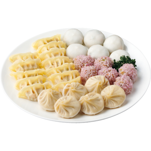 【海鮮餃子】具(野菜(にんじん(国産)、長ねぎ(国産)、しいたけ(国産)、しょうが(国産))、えび(インドネシア)、魚肉すり身(たら(国産)、砂糖)、いか(ペルー)、豚脂(国産)、砂糖、発酵調味料、食塩、昆布(国産))、皮(小麦粉(小麦(国産))、食塩)、打ち粉(ばれいしょでん粉(ばれいしょ(国産)))【ネギにらまんじゅう】具(えび(インドネシア)、野菜(にら(国産)、長ねぎ(国産)、しょうが(国産))、鶏肉(国産)、砂糖、豚脂(国産)、でん粉(ばれいしょ(国産))、ごま油、食塩、ラード(豚肉を含む)、酵母エキス、こしょう)、皮(でん粉(ばれいしょ(国産)、タピオカ、小麦(国産))、小麦粉(小麦(国産))、ラード(豚肉を含む)、米粉(米(国産))、水あめ(甘しょ(国産)、ばれいしょ(国産))、大豆粉(大豆:遺伝子組み換えの混入を防ぐため分別))、打ち粉(でん粉)/加工デンプン(ばれいしょ・【小籠包】具(豚肉(国産)、野菜(玉ねぎ(国産)、しょうが(国産))、豚脂(国産)、オイスターソース(大豆(遺伝子組み換えの混入を防ぐため分別)・小麦を含む)、ごま油、しょうゆ(大豆(遺伝子組み換えの混入を防ぐため分別)・小麦を含む)、砂糖、ゼラチン、チキンエキス、食塩、こしょう)、皮(小麦粉(小麦(国産))、ラード(豚肉を含む)、食塩)、打ち粉(でん粉)/加工デンプン【桜珍珠丸子(もち米肉団子)】食肉(豚肉(国産)、鶏肉(国産))、もち米(国産)、野菜(長ねぎ(国産)、たけのこ(国産)、にんじん(国産)、しいたけ(国産)、しょうが(国産))、でん粉(ばれいしょ(国産))、えび(インドネシア)、鶏卵(国産)、砂糖、食塩、清酒、しょうゆ(大豆(遺伝子組み換えの混入を防ぐため分別)・小麦を含む)、米酢、こしょう/着色料(紫いもパウダー)、重曹