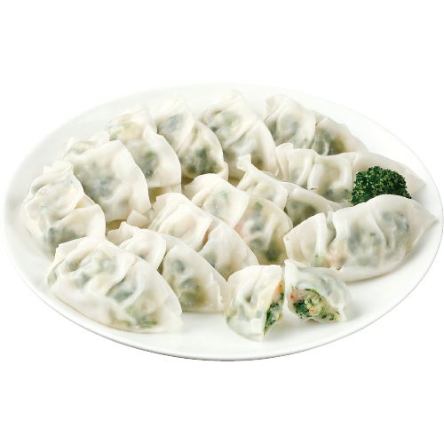 提携先の海老と消費材の親鶏にニラ、ねぎを入れ、グラニュー糖とごま油、塩でシンプルに味付けしました。皮が半透明で見た目もきれい。具にしっかり味がついているので焼いてそのままどうぞ。海老の風味と食感が楽しめます。