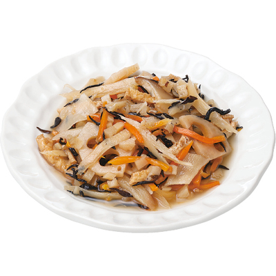 野菜(ごぼう(国産)、にんじん(国産))、醸造酢(国内製造)、砂糖、たけのこ水煮(たけのこ(国産))、れんこん水煮(れんこん(国産))、油揚げ(大豆(国産)(遺伝子組み換えの混入を防ぐため分別)、なたね油(遺伝子組み換えの混入を防ぐため分別))、食塩、しょうゆ(大豆(遺伝子組み換えの混入を防ぐため分別)・小麦を含む)、かつおけずり節、干しひじき(ひじき(国産))、乾しいたけ(しいたけ(国産))、かんぴょう(夕顔(国産))、魚介調味エキス(さばを含む)/凝固剤(粗製海水塩化マグネシウム)、酒精、pH調整剤(クエン酸)、酸化防止剤(ビタミンC)、増粘剤(キサンタンガム)