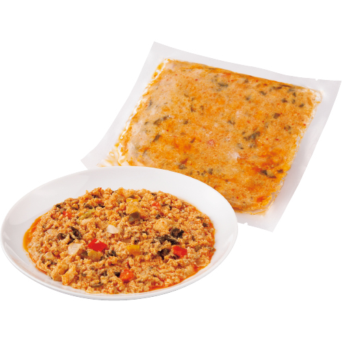 丹精國鶏を使用したガパオライスの具。赤パプリカ、黄パプリカ、ピーマンで彩りよく、ピリ辛味でご飯がすすみます。湯せんで温めてご飯にかけるだけ。家庭で手軽にタイ料理が楽しめます。1袋で1食分で2袋入りです。