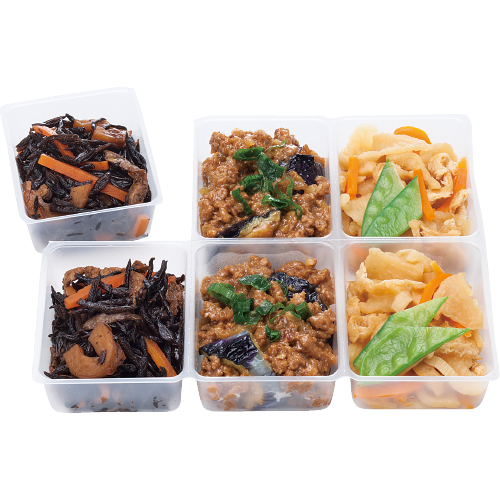 ひじき煮、切干大根の煮物、麻婆なすの3種のおかずを2個ずつセット。