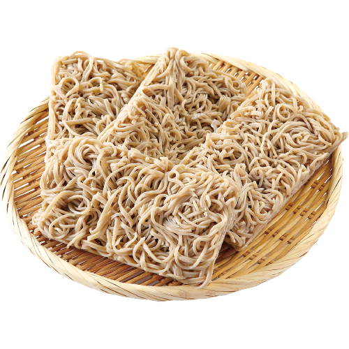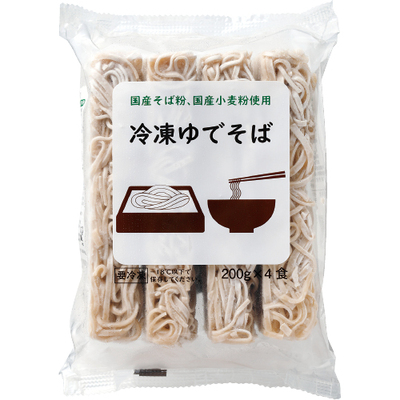 国産そば粉40%、国産小麦粉60%を配合した4割そば。そば粉は、実を丸ごとロール挽き製粉した「挽きぐるみそば粉(全層粉)」を使用。 冷凍ゆで麺でありながらそばの香りと食感が楽しめます。 ゆでたてを急速冷凍しています。冷凍のまま調理可能。ざるそば、かけそばはもちろん、食塩不使用なので鍋の〆(締め)そばにも。