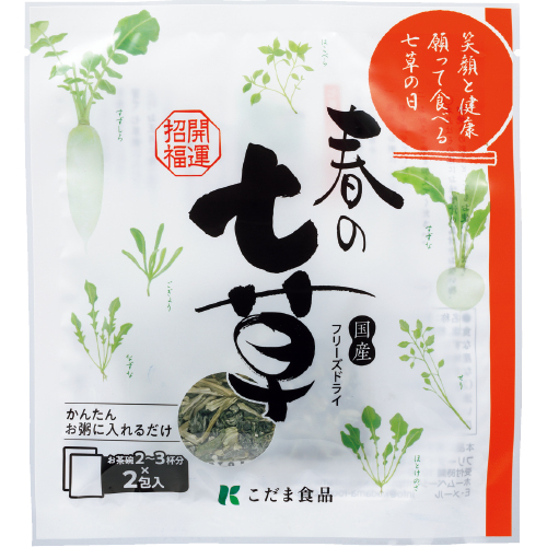 国産の七草(すずしろ、すずな、はこべら、せり、なずな、ほとけのざ、ごぎょう)を下処理してフリーズドライ。温かいお粥に振りかけて混ぜるだけで簡単においしく食べられます。お好みで塩を加えてください。1包でお茶碗2〜3杯分。お味噌汁の具材やお吸い物、卵焼きの彩りにも。