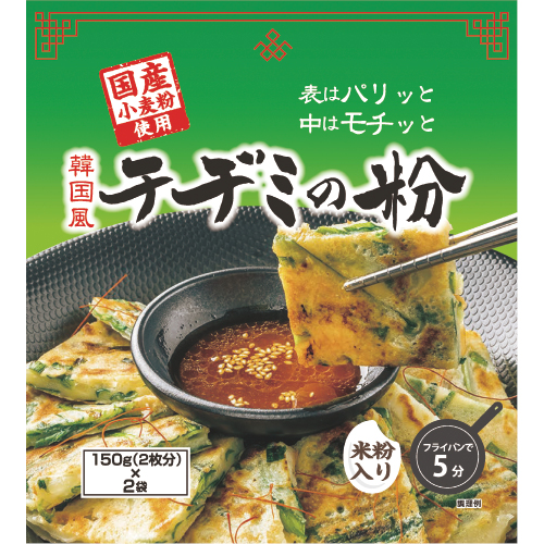表面はパリッと中はもちっとした食感に仕上がるチヂミ粉。1袋150gで約25cm大のチヂミが2枚できます。