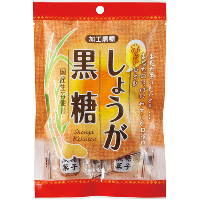 沖縄県産黒糖に国産しょうが粉末を加えてつくりました。お茶請けにどうぞ。お湯に溶いて、しょうが湯にも。