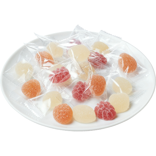 果物からつくったペクチンに国産のぶどう・いちご・レモン・りんごの果汁を加えた一口タイプのゼリー。それぞれの果物の形にし、個包装にしたものを詰め合わせました。1個約6g。