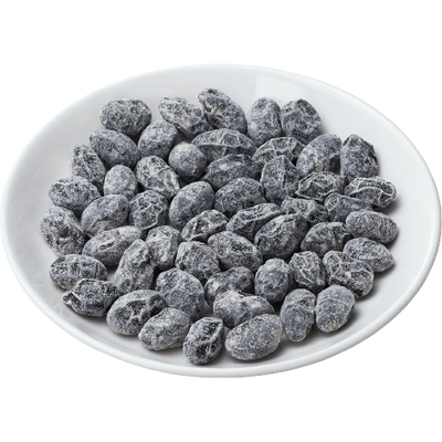 国産の丹波黒豆を使用。ビートグラニュー糖と塩で味付けし、和三盆糖をまぶした上品な甘さです。