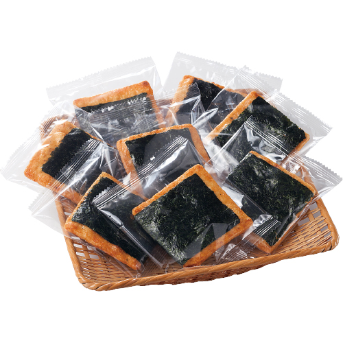 消費材の伊勢のりを贅沢に巻きました。醤油とのりの香り、パリッとした歯ごたえが楽しめます。個包装。
