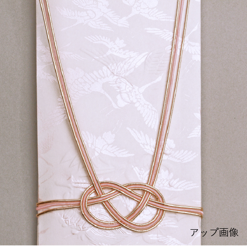箸袋全体に空を舞う鶴の上品な姿が描かれており、あわじ結びの水引が食事を華やかに彩ります。