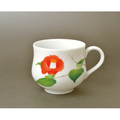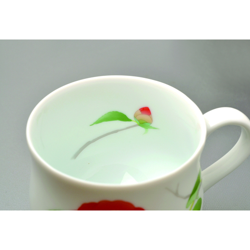 赤い椿の花が鮮やかで印象的なマグカップ。