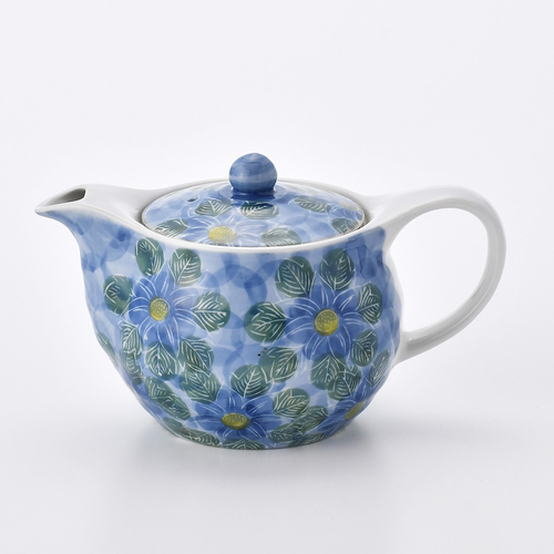 手作業で描かれた鉄仙花のポット型急須。濃淡のある青が印象的な趣があります。