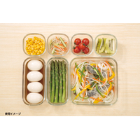 ●耐熱ガラス(耐熱温度差:120℃)、フタ:ポリプロピレン(耐熱温度:140℃)●大:18.6×18.6×高5.5cm(フタセット時)、長角:18.5×9.3×高5.5cm(フタセット時)、小:フタを含む外寸9.5×9.3×高5.5cm●大:1200ml、長角:500ml、小:200ml●大:640g、長角:320g、小:160g●タイ製または中国製※フタはかぶせる程度で密閉式ではありません。フタ