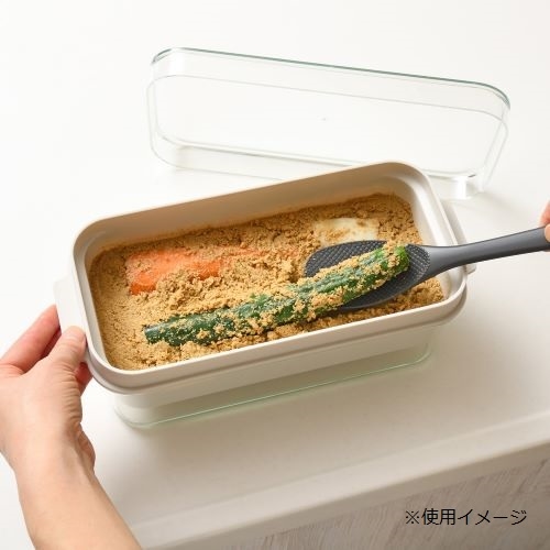 ●外容器・フタ:飽和ポリエステル樹脂、内容器・しゃもじ:ポリプロピレン●幅29.6×奥行13.2×高さ10.5cm●560g●内容器/適正容量:ぬかどこ1㎏、外容器/満水容量:2.1L(適正容量:200ml)●外容器・フタ:耐熱温度80℃・耐冷温度-20℃、内容器・しゃもじ:耐熱温度110℃・耐冷温度-20℃●日本製