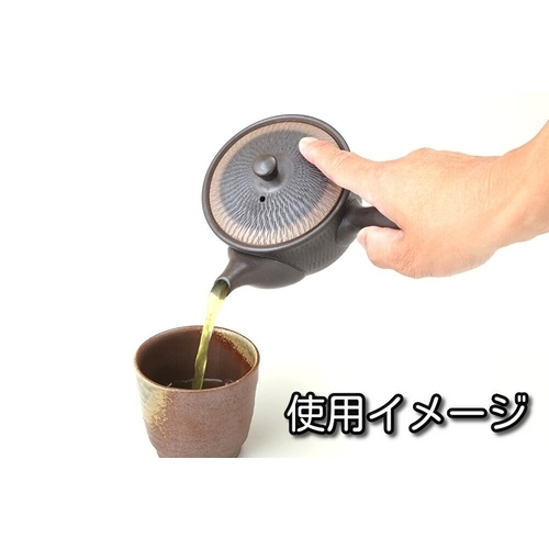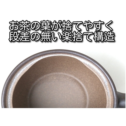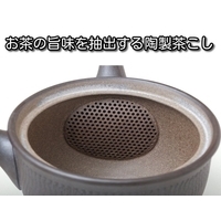 内側は釉薬を掛けていない焼締陶土はお茶の渋を吸着します。茶こしは陶製でお茶の風味を損ないません。茶殻が捨てやすい楽捨て構造です。
