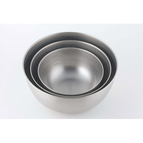 底の平たい部分が広めなので安定性が良く、あえる、まぜる、つぶすなどの作業がしやすいのが特徴です。表面は傷が目立たない艶消し仕上げ。目安の目盛り付。