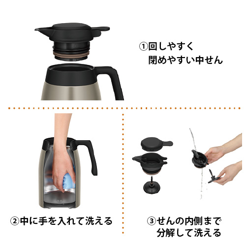 注ぎやすいワンタッチレバー。広い口径と分解できる中せんで隅々まで洗えて衛生的です。倒れてももれにくいのでテーブルに置いても安心。