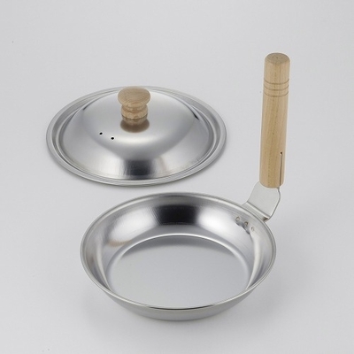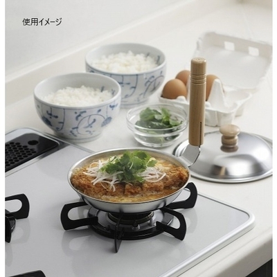 ハンドルが立っていて隣の鍋などにぶつかりにくい形状。丼のご飯の上へ滑らせて、きれいに盛り付けできます。フタをして玉子ふっくらと仕上げられます。親子丼・カツ丼・牛丼づくりなどたまごでとじる丼物全般に適しています。フタは丼のフタにも使えます。