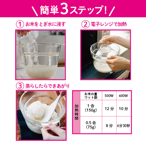 電子レンジ加熱時間は10分(600w)、一度炊きでご飯が0.5合〜1合炊けます。におい移り/におい残りしにくく、パーツが少なくお手入れ簡単。炊飯以外の電子レンジ調理にも。