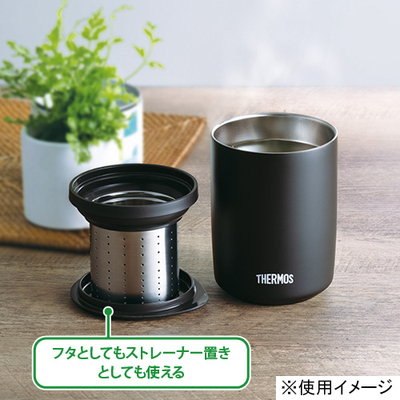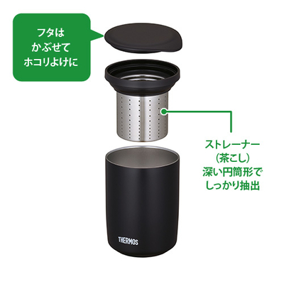 ストレーナー付きでお茶が作れ、作ったお茶を保温・保冷できる。フタはストレーナー置きとしても使えます。冷たい飲みものでも結露しにくいのでテーブルを汚しません。熱々の飲みものを入れても外側が熱くなりません。ステンレス製魔法びん構造なので飲み頃温度をキープ。
