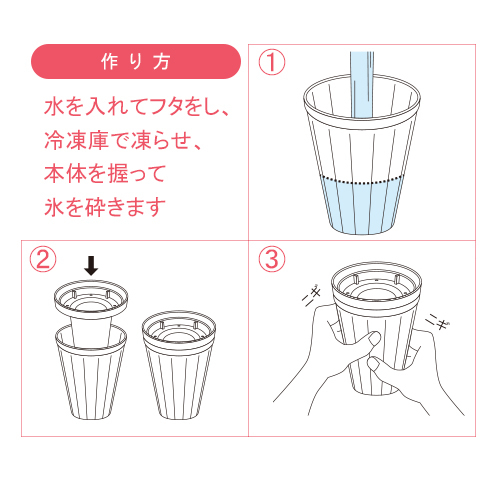 握って砕いて、自分好みのサイズのクラッシュアイスが作れる。やわらかい素材の製氷器です。一個でコップ一杯にちょうどいい量の氷が作れます。牛乳を凍らせればカフェラテに。