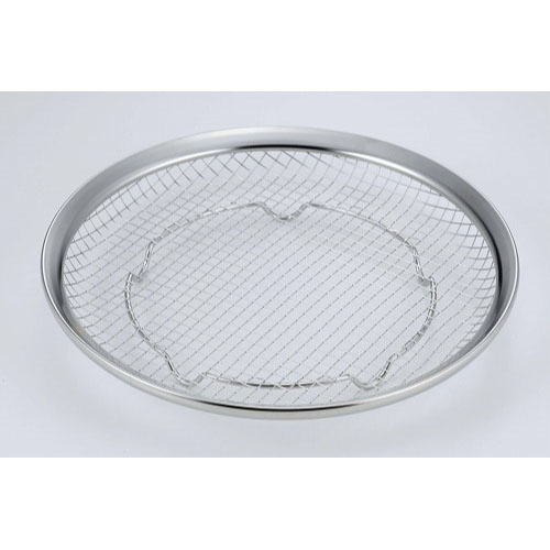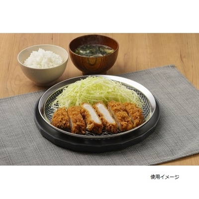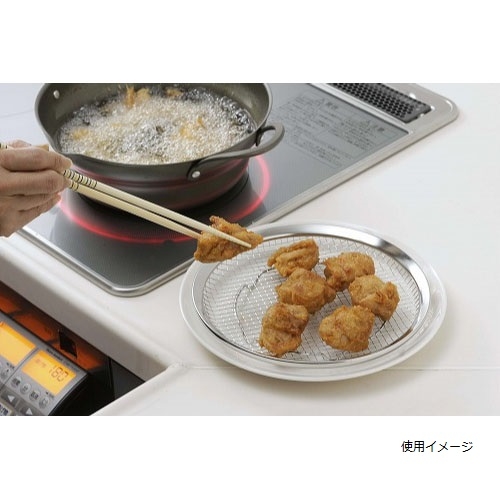 お持ちの皿にセットして、揚げ鍋から盛り付けてそのままテーブルへ。バット代わりに使え、洗い物も削減。アミ目が大きく油が切れやすく、底が浮いているので余熱でベチャっとなりにくい。アミは交わる点すべてが溶接されているので、丈夫で汚れ落ちもすっきり。
