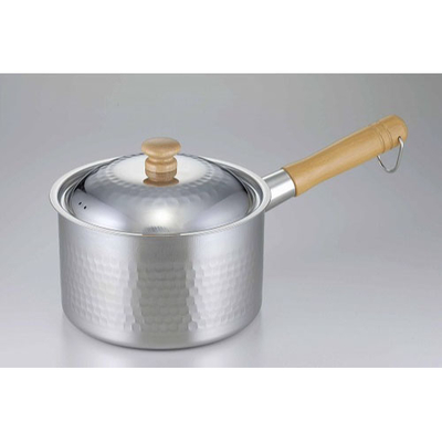 フタ付きで深さがあります。握りやすい木製ハンドル。槌目模様を付けて強度を高めた丈夫な作り。