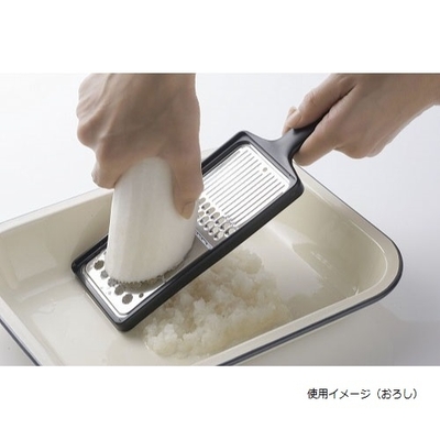 千切りは押し削りタイプで大根や人参に味が浸み込みやすい刃です。おろしは薄板の鋭く丈夫な刃で大根を切るようにおろすので繊維がつぶれにくくシャキシャキ食感に仕上がります。丈夫なステンレス製で色やニオイが移りにくく清潔を保ちやすい。