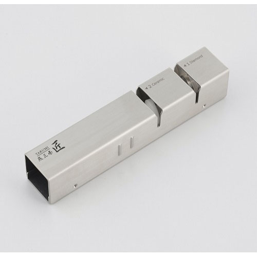 ●荒砥石:ダイヤモンド砥石、仕上砥石:アルミナ系セラミック砥石、本体・カバー:18−8ステンレス、すべり止めゴム:CBRゴム●幅15×奥行2.7×高さ3cm●160g●日本製 ※ステンレス製・チタン製の両刃包丁専用