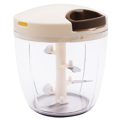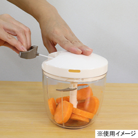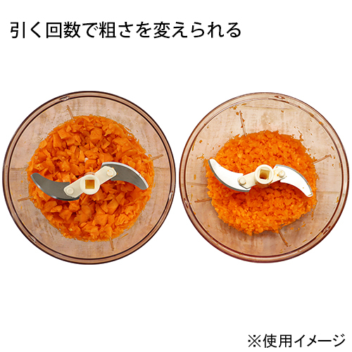 ハンドルを引くと刃が回転し、食材を細かく、好みのサイズにカットします。本体には丈夫で耐久性に優れたトライタンを使用。
