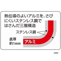 ●本体:18−8ステンレス・アルミ・18−0ステンレスの三層鋼(底厚1mm)、フタ:18−0ステンレス、ハンドル・ツマミ:13−0ステンレス●幅33.6×奥行25.8×高さ15cm、内径25.5×深さ9(段下6.5cm)●965g●4.6L●IH対応●日本製