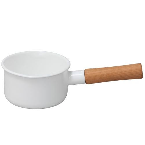 インテリアに馴染むカラーと自然な風合いを生かした天然木の取っ手の組み合わせのミルクパン。少量の茹でものや、離乳食つくりにも便利です。利き手を選ばない両口付き。