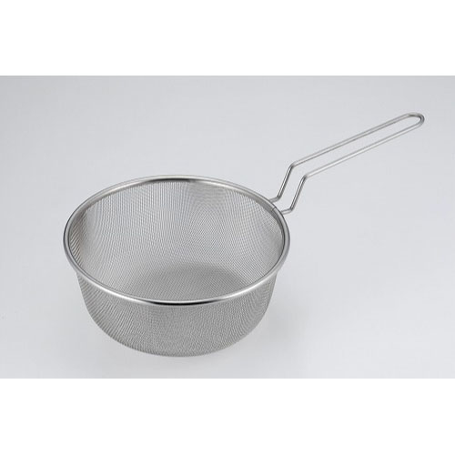 アミ目が細かいので細い麺も飛び出しません。鍋のフチに当たりにくい段差つきハンドル。