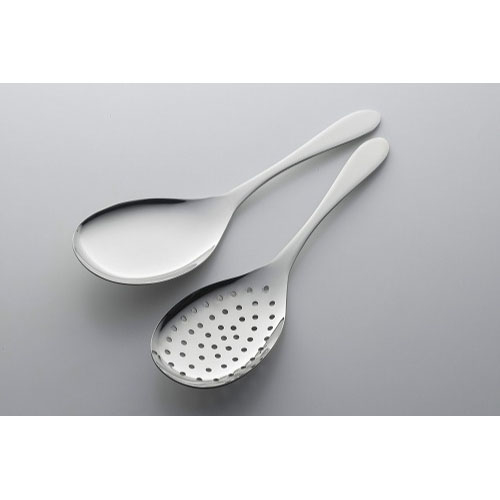 日常使いからパーティーなどの大皿料理の取り分けに。皿部が大きく使いやすいスプーンと穴明スプーンのセットです。