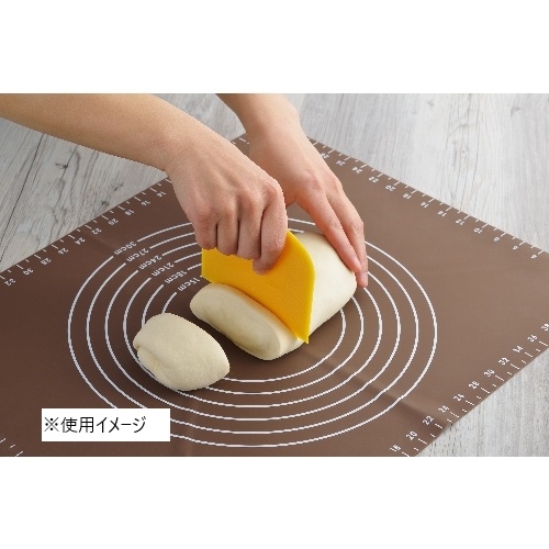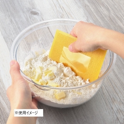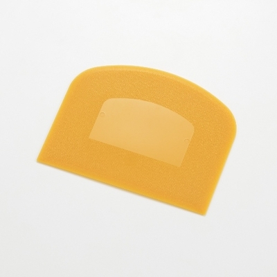 生地ばなれが良いエンボス加工のスケッパー。パン生地の白が見やすいマスタードカラーです。ほどよい「しなり」で製パンや製菓に役立ちます。