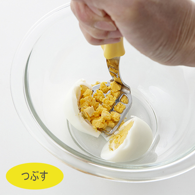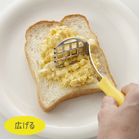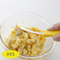 これ1つでゆでたまごを手早くつぶしてたまごサンドをつくれます。先端でたまごを切る、つぶす、混ぜる、盛り付けるまで対応でき、ボール1つで完了します。包丁とまな板いらず、洗い物も少なくなります。