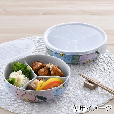 三品盛り付けができる仕切り付のノンラップ鉢。残った食材は蓋をしてそのまま冷蔵庫保存できます。蓋は完全密封ではありません。