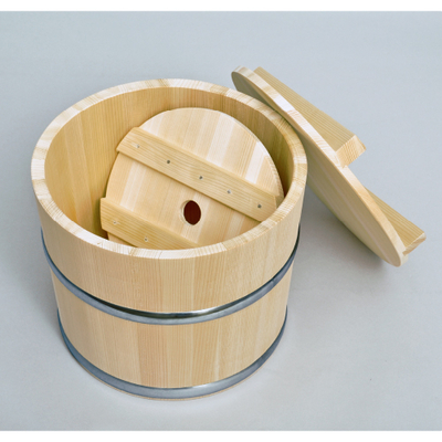 昔ながらの木樽で、味噌づくり。味噌が11kg入るサイズです。