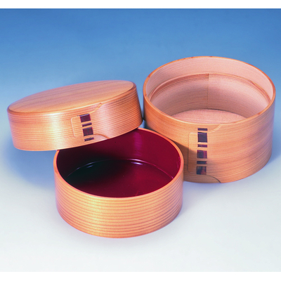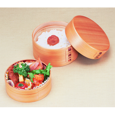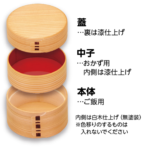 ご飯とおかずを分けて入れられる2段重。ご飯を入れる下段は、あえて白木仕上げに。ご飯にかすかに秋田杉の香りが移り、おひつ同様に吸水性が高いため、ご飯がいたみにくく冷めても美味しく食べられます。上段は耐久性の高い漆仕上げ。